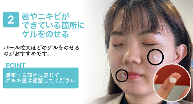 ステップ② その上から唇のひび割れやニキビが出ている部分に、パール粒大ほどのゲルをこんもりとのせる