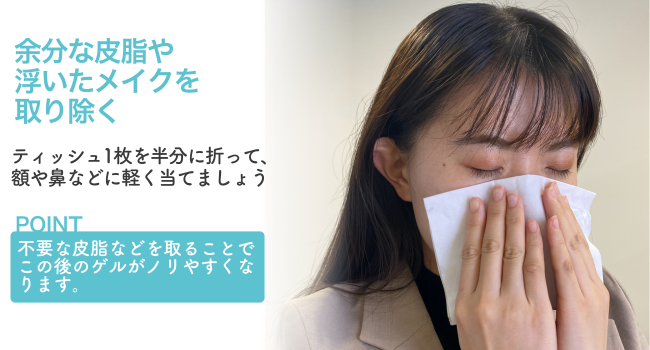日中行う場合は、ステップ①の前に、ティッシュオフをして余分な皮脂を落としましょう。