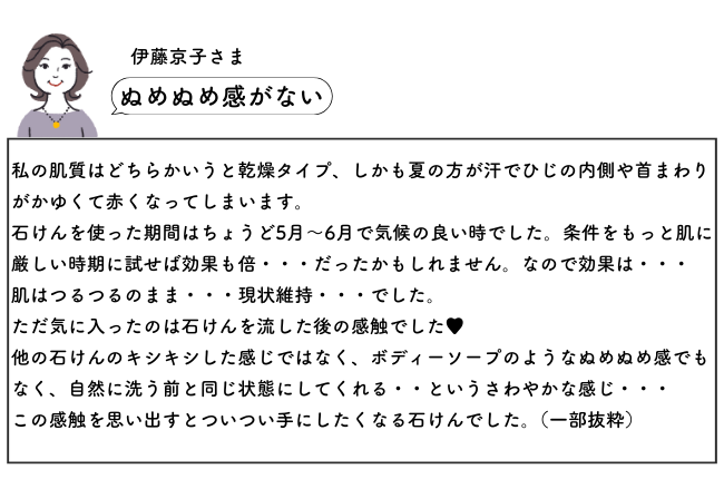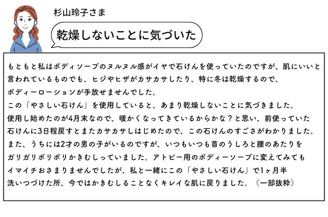 実際にやさしい石けんをお使いいただいたウキウキメイト様からいただいたお声でも