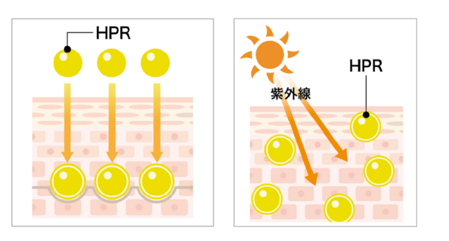この弱点を補い、効果や特長を生かした成分が、レチノイン酸ヒドロキシピナコロン(HPR)です。刺激性が低く、効率的に効果を発揮します。