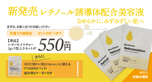 ぜひ、この機会に、3包入りでお肌に合うことを確かめた上で、安心してレチノモイスチャーでのケアをお得に始めてくださいませ。