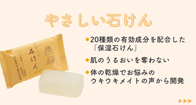20種類以上の保湿成分を配合し、石けん素地の配合量を低く調整することで、石鹸の課題である強い洗浄力を、克服しました。