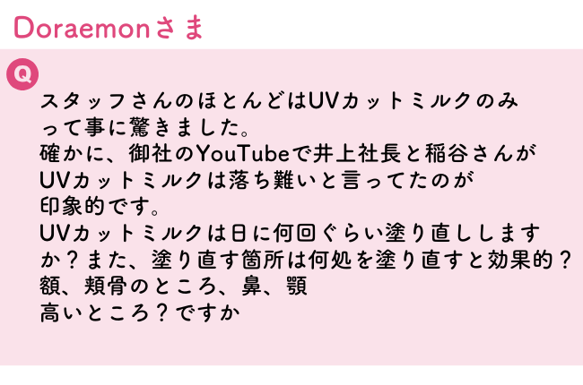 先日、ウキウキメイト様から「UVカットミルクを塗ると顔だけが白く、浮いてるように見えます。」というお声をいただきました。