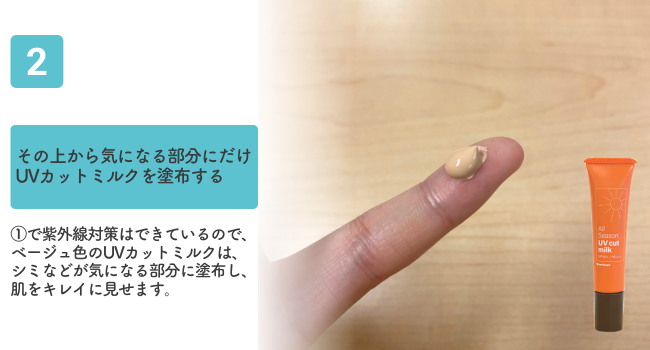 ・シミや赤みが気になる部分には、UVカットミルクを重ね塗り