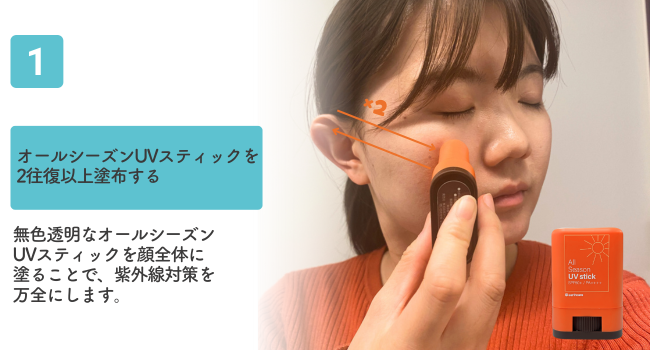 【古市、稲谷、尾嶋】外出時やレジャーの際は、摩擦や汗で落ちやすいため、オールシーズンUVスティックを活用してこまめに塗り直します。
