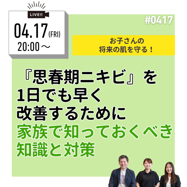 思春期ニキビに悩んでいたお子さんを持つ代表の井上が「親として、どうお子さんと向き合い、何を伝えるべきか」ということもお話しします。