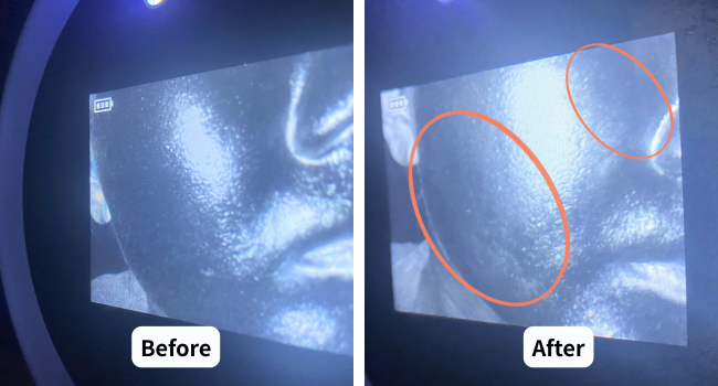 (※UVカメラで、変化を観察しました。オールシーズンUVスティックが塗布されている箇所は黒く映ります。)