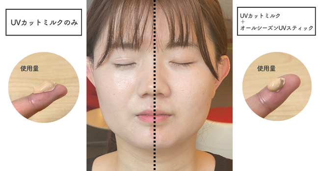 併用することで、UVカットミルクの使用量が少なくなり、顔だけ浮かなくなったのがお分りいただけるかと思います。