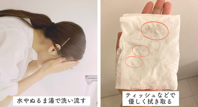 水で洗い流せない部分は、ティッシュなどでポロポロを取ってください。