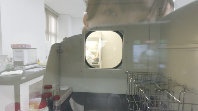 空気中の菌の影響を避けるため、一般エリアとクリーンルームは直接つながっていません。検体は「パスボックス(前室)」を通じて受け渡され、人も専用の除菌室で菌を落としてから入室します